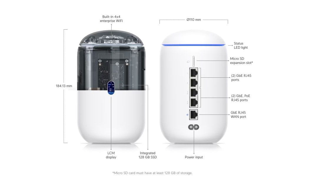 Ubiquiti UDR-EU potpuno opremljen UniFi Gateway ruter s ugrađenom WiFi 6 pristupnom točkom i konektorima koji podržavaju PoE izlaz. Ima ugrađenu WiFi6 4×4 MIMO tehnologiju, RJ-45 priključak, SSD disk kapaciteta 128 GB te podržava proširenje memorijskih medija putem SD utora.