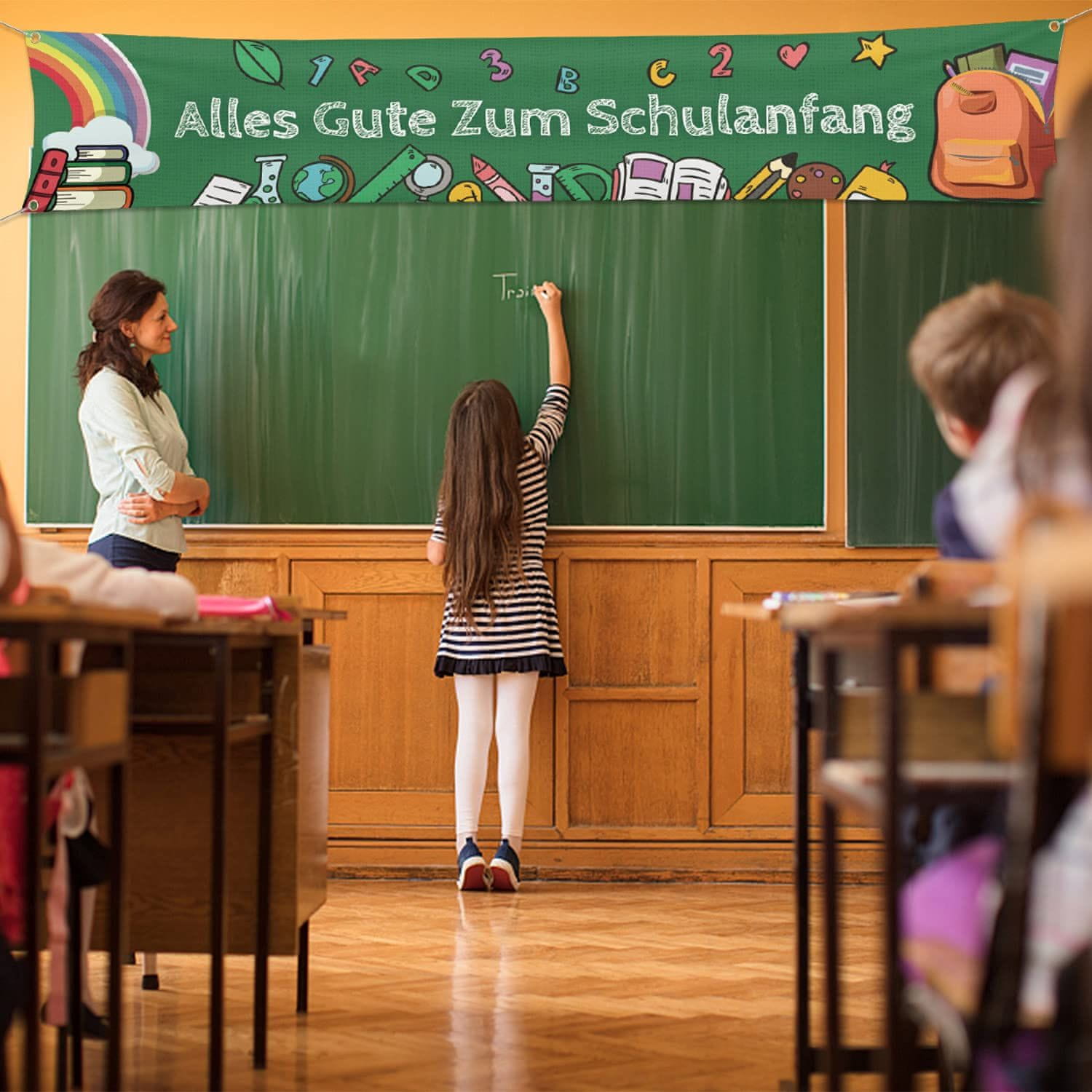 Započnite novu školsku godinu s posebnim bannerom „Alles Gute zum School“! Ovaj impresivni, zeleni banner dimenzija 210 × 40 cm izvrsna je dekoracija za školske događaje, kako u zatvorenom tako i na otvorenom. Izrađen od visokokvalitetnog PVC materijala i izdržljivog, ekološki prihvatljivog kartona, banner je trajan, šaren i otporan na kidanje, što ga čini idealnim dodatkom za svaku proslavu. Banner ima lijep dizajn sa školskim motivima, kao što su školska torba, olovke, ravnala i drugi obrazovni simboli, koji će unijeti živahan i radostan ugođaj na svaku zabavu. Možete ga objesiti na vrata, ograde, verande, zidove ili gdje god želite kako biste dodali boju i atmosferu svojoj proslavi. Banner je jednostavan za korištenje i uključuje dugu bijelu uzicu koja se može skratiti prema vašim potrebama. Također se može ponovno koristiti, što ga čini ekonomičnim i ekološkim izborom. Imajte na umu da set ne uključuje kolce ili klinove za pričvršćivanje.