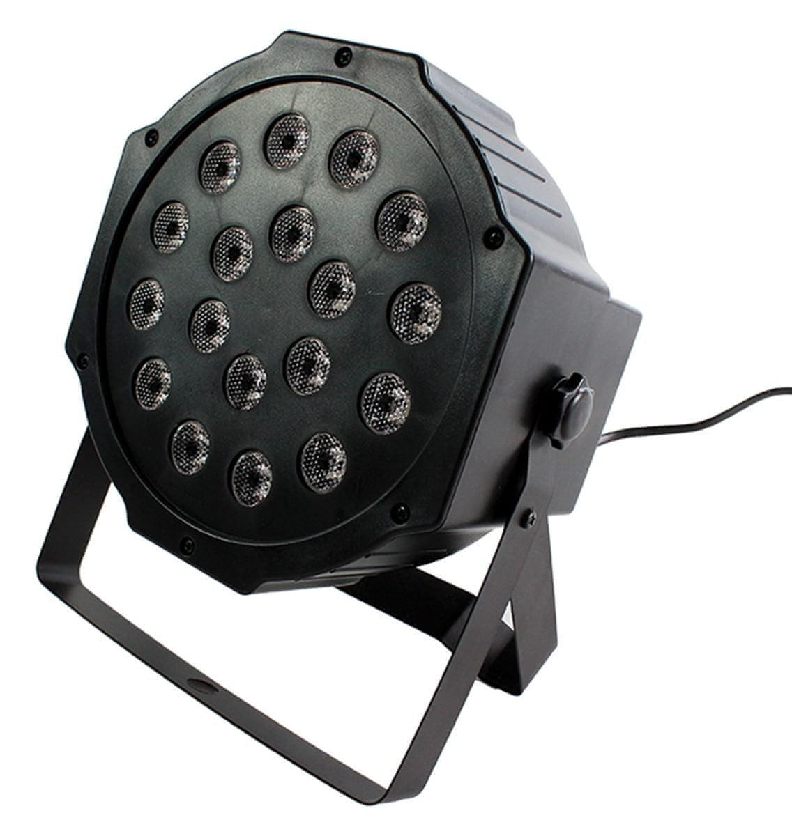 Disco svjetla – kolorofon 18 dioda, 3 boje RGB dioda sa okvirom. Reflektor je opremljen sa osamnaest RGB LED dioda snage 1W svaka. Svi oni daju jako svjetlo dugog dometa! Zahvaljujući širokoj paleti boja (RGB), bit će izvrstan kao dekorativna rasvjeta za DJ-e, bendove, zabave, vjenčanja pa čak i klubove!