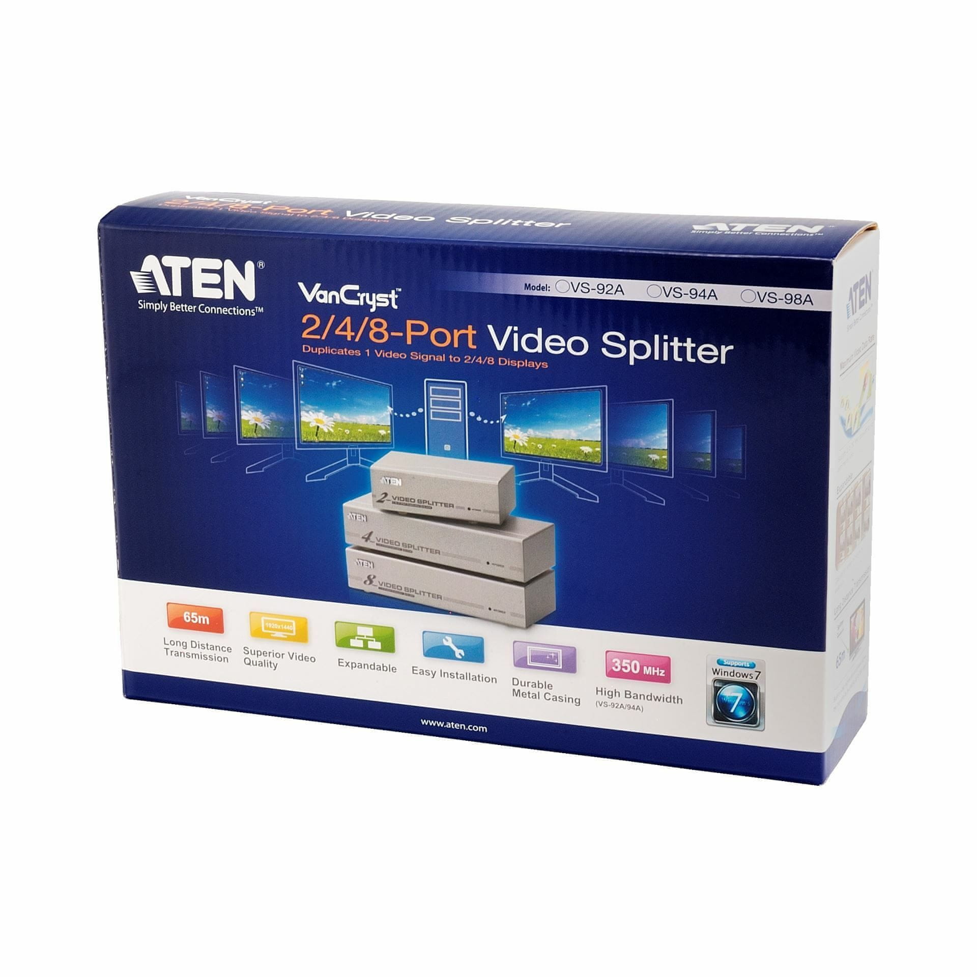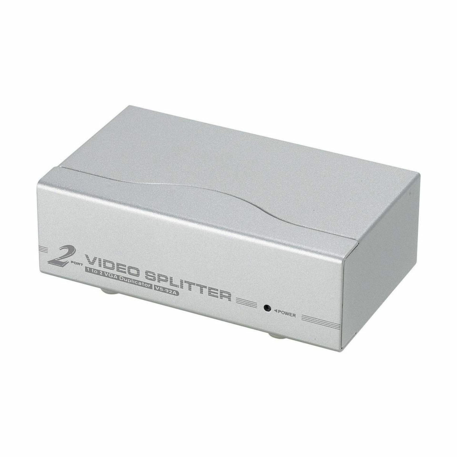 Aten VGA splitter VS92A prenosi signal s jednog računala na dva analognih monitora, 1 HDB-15 muški video ulaz na 2 HDB-15 ženska video izlaza.