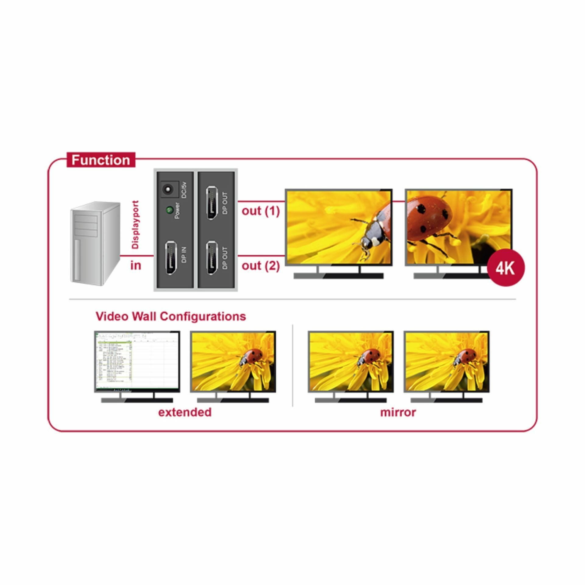 Ovaj razdjelnik proizvodnje Delock prima DisplayPort signal sa stolnog ili prijenosnog računala i razvodi ga na dva spojena zaslona. Stoga se DisplayPort priključak može koristiti za pogon dva DisplayPort monitora. Oba izlaza mogu raditi u dva načina rada (DP++) pa se preko odgovarajućih prilagodnika mogu spojiti HDMI ili DVI monitori.