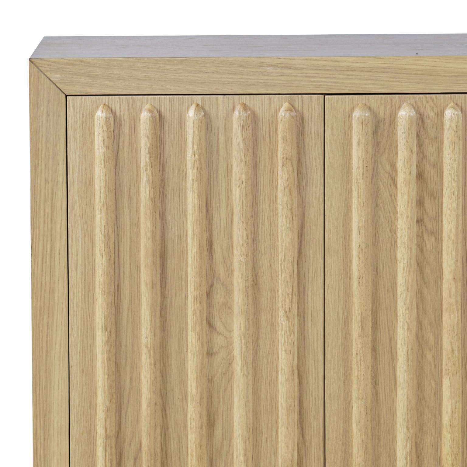 Nowoczesna komoda w kolorze jasnego drewna funkcjonalny mebel do salonu sypialni lub jadalni cztery drzwi z systemem push to open wygodny dostęp do przechowywanych przedmiotów prosta forma z ryflowanym frontem i wyraźną strukturą drewna elegancki i nowoczesny wygląd detale: ryflowane drewno kolor: naturalne jasne drewno liczba drzwi: 4 liczba półek: 2 materiał: drewno dębu amerykańskiego i kauczukowca fornir brzozowy montaż: zmontowane rodzaj zawiasów: puszkowe uchwyty: push to open waga (kg): 82 wymiary (S x W x G cm): 1525 × 815 × 46 cm kolor (odcień): brązowy wysokość (cm): 815 głębokość / szerokość (cm): 46 długość (cm): 1525 przeznaczenie: dla dorosłych rodzaj drewna: dąb materiał (szczegóły): drewno panel – drewno liczba szuflad: 4 szuflady z oświetleniem LED: bez oświetlenia LED modułowość: stała