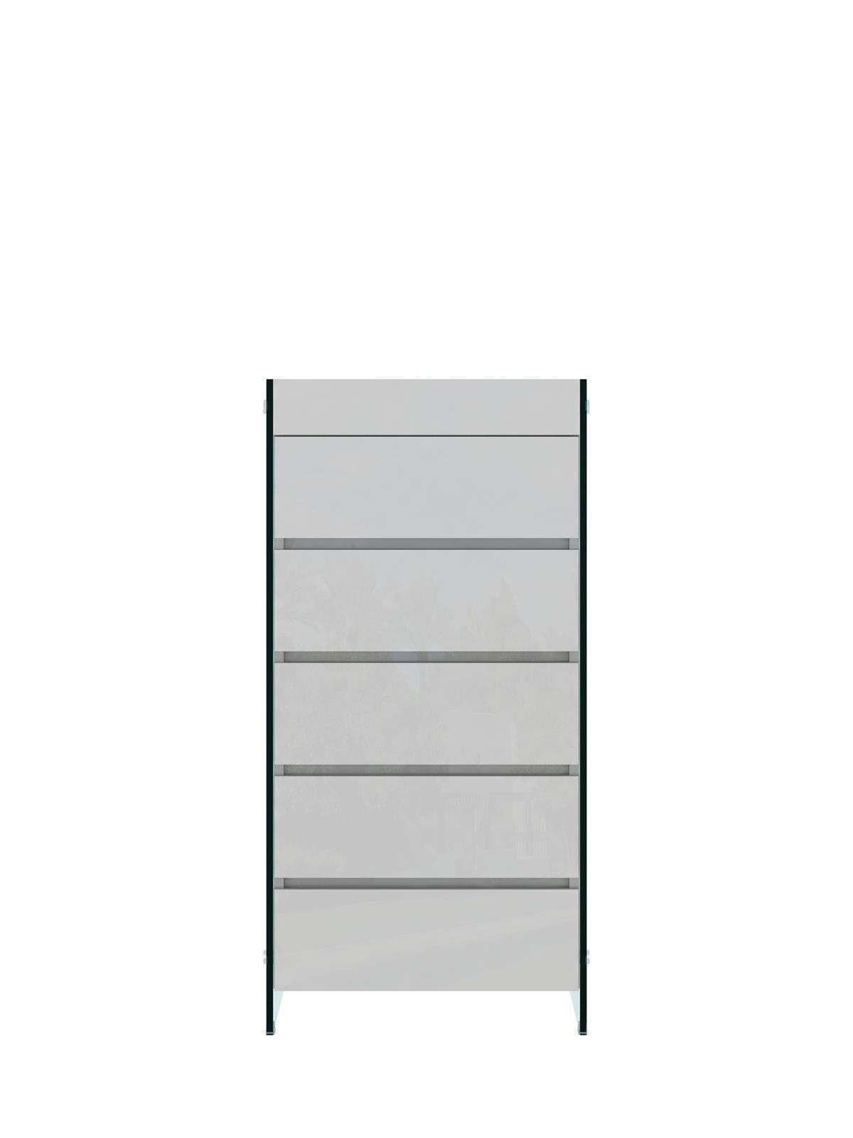 Komoda u bijelom visokosjajnom finišu kombinira jednostavan oblik s elegantnim akcentom koji daju noge od kaljenog stakla s vidljivim kromiranim spojevima. Ovaj komad namještaja dizajniran je kako bi unio moderan i sofisticiran dojam u svaki interijer nudeći stil i praktičan prostor za pohranu. Idealan je za prostore za odrasle gdje su poželjni profinjena estetika i funkcionalnost.