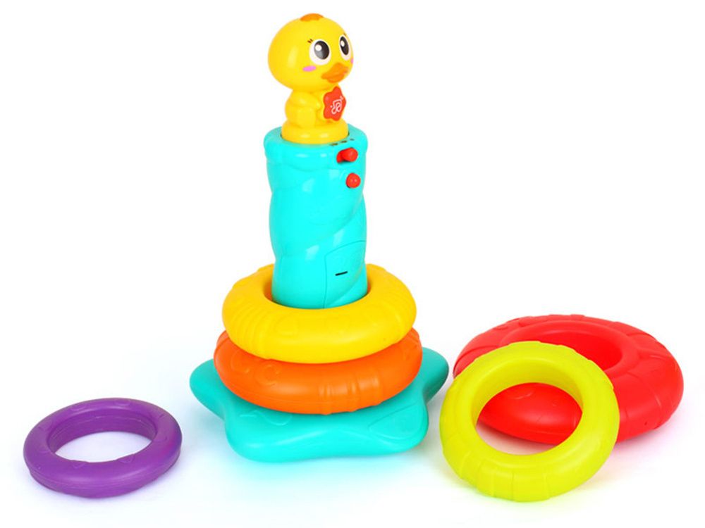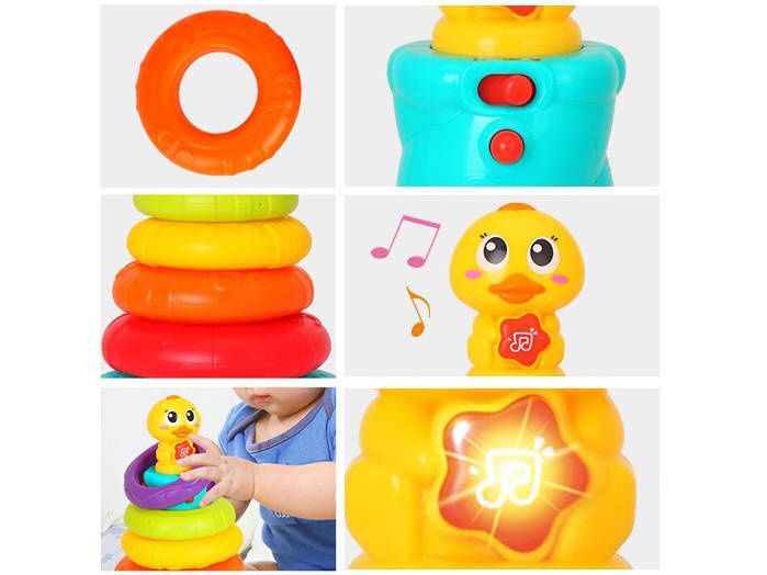 Šarena i zanimljiva edukativna piramida za najmlađe. Igračka sadrži 5 obojenih obruča za stavljanje, interaktivnu šipku završenu glavom patke.