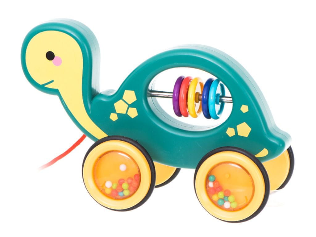 Drvena igračka u obliku kornjače. Bicikli su opremljeni kuglicama koje zveckaju tijekom vožnje. Unutra je pet šarenih krugova kojima se može neovisno kretati. Duga vrpca vam, na primjer, omogućuje da ponesete igračku sa sobom. u šetnju. Dimenzije kornjače: 19,5×9×12,5 cm.