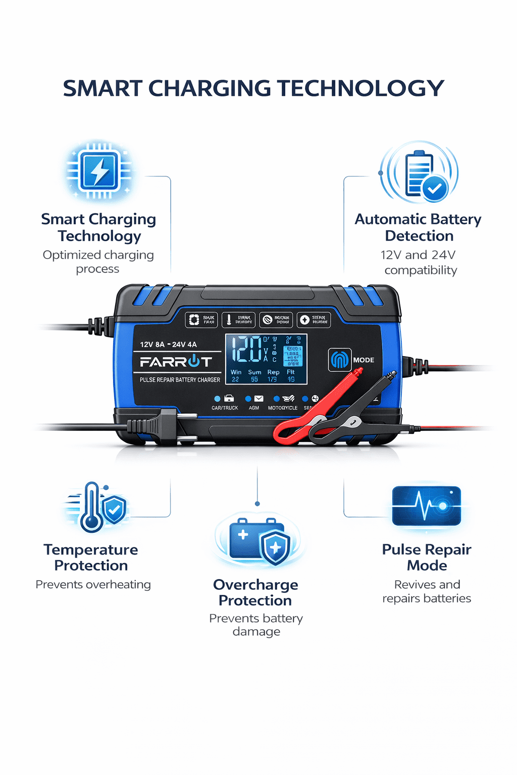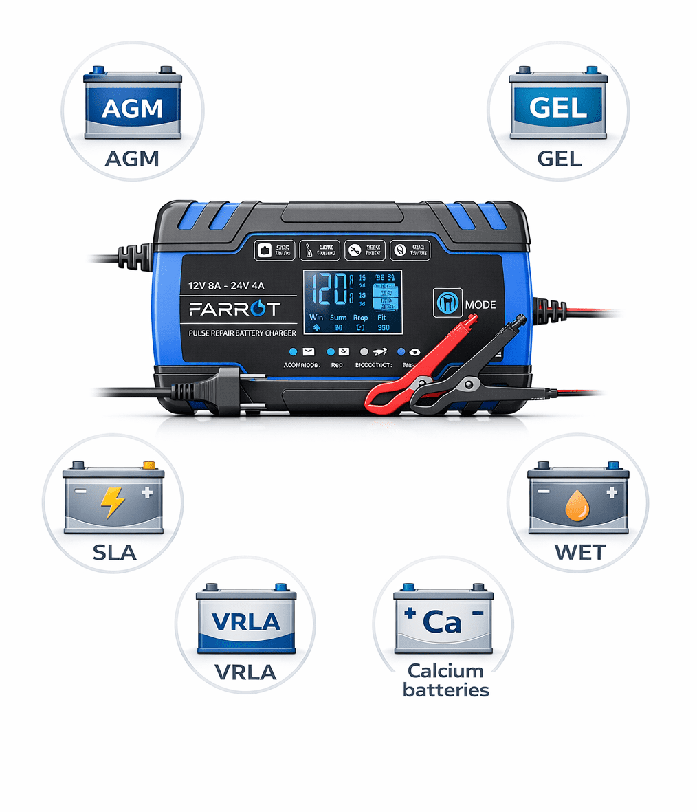 Farrot Automatski punjač akumulatora 12V 8A / 24V 4A pametni punjač baterije LCD za auto, motor, ATV i brod – smart charger