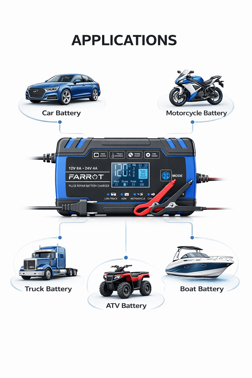Ovaj praktičan uređaj idealan je za garažu, radionicu ili kućnu upotrebu, te omogućuje brzo vraćanje energije u akumulatore automobila, motocikla i drugih vozila.
