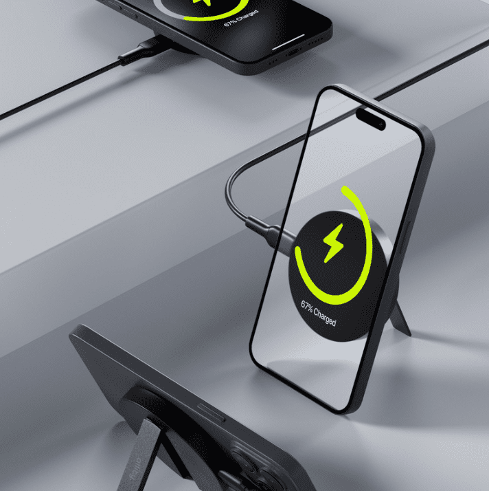 Otkrijte nove načine korištenja pametnog telefona tijekom punjenja. Bežični punjač spreman za putovanja nije samo punjač, već i magnetski stalak za vaš telefon. Postavite uređaj okomito ili vodoravno prema potrebi. Savršen je za gledanje videa, videopozive ili korištenje aplikacija tijekom punjenja.