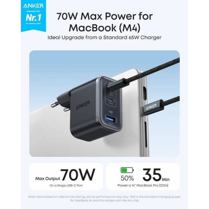 Napajajte svoj MacBook stvarnom snagom od 70 W: Svaki USB-C priključak isporučuje do 70 W snage — dovoljno za punjenje 14-inčnog MacBook Pro (2024) od 0 do 50 % za 35 minuta. U usporedbi sa standardnim 65 W punjačem omogućuje brže punjenje i bolju kompatibilnost s najnovijim M4 modelima.