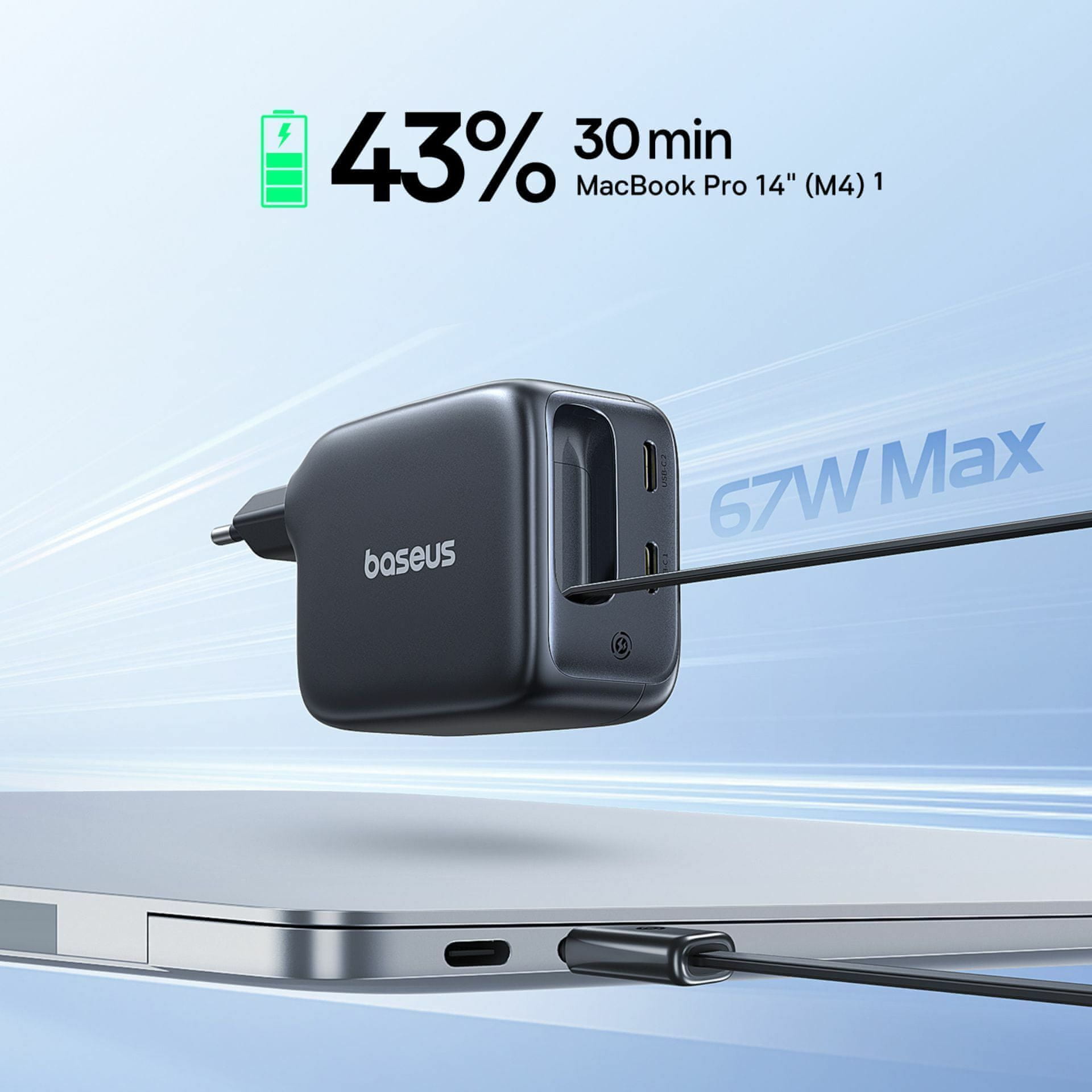Baseus EnerCore CJ11 je 67W punjač s GaN tehnologijom, namijenjen brzom punjenju USB TipC uređaja. Opremljen je s tri sučelja USB-C, koja omogućuju pojedinačno ili kombinirano punjenje do 65 W. AI kontrola u stvarnom vremenu prilagođava snagu punjenja prema priključenom uređaju.