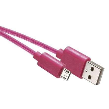 USB kabel 2.0 A/M – micro B/M 1m – ružičasti USB kabel okruglog dizajna i ružičaste boje. Tekstilni oplet. Pogodan je za mobilne telefone i druge mobilne uređaje.