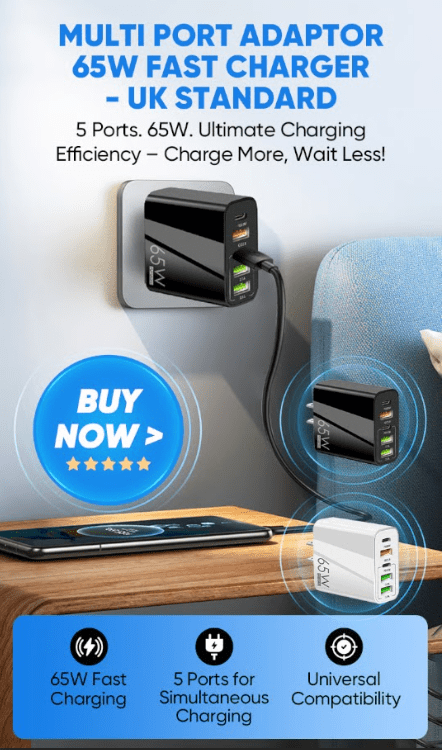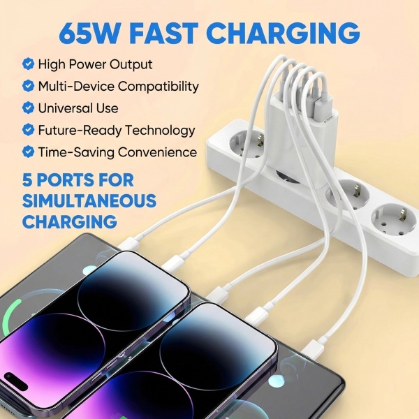 VYZIO® 65W brzi putni punjač s 5 priključaka, brzo punjenje, zaštita od pregrijavanja, kompatibilan s Apple i Android | SPEEDPOD