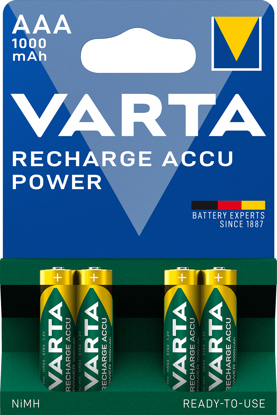 Punjive baterije s tehnologijom spremnosti za upotrebu – baterije su prethodno napunjene i tako spremne za upotrebu. Varta Power 4 AAA punjive baterije 1000 mAh R2U 5703301404 mogu se koristiti na uređajima poput računalnih miševa, igračaka ili monitora za bebe. Pakiranje sadrži 4 napunjene baterije.