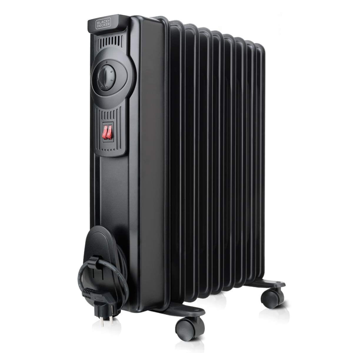 Električni uljni radijator sa podesivim termostatom i 2 brzine. 1500W Black+Decker BXRA1500E ima sigurnosnu značajku automatskog isključivanja u slučaju pregrijavanja, svjetlo upozorenja na pregrijanu opremu i ugrađenu ručku i kotače za jednostavno prenošenje.