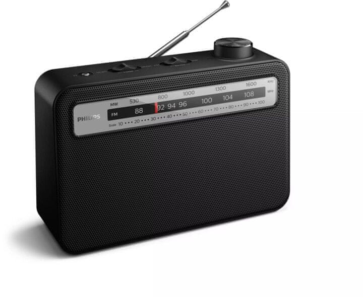 Zahvaljujući prijenosnom dizajnu, navečer možete slušati svoje omiljene radio emisije i u potpunosti uživati u pjesmama na terasi dok pijuckate vino, u vrtu, na poslu, u kuhinji dok kuhate i svugdje drugdje i u svim vrste aktivnosti, sve s Philips radiom TAR2506, opremljenim FM/MW prijamnikom. Zbog svog tradicionalnog dizajna izgleda dobro u svakoj sobi i jednostavan je za upotrebu, pa podešavanje na postajama sa bočnim kotačićem za podešavanje nikome ne predstavlja problem.