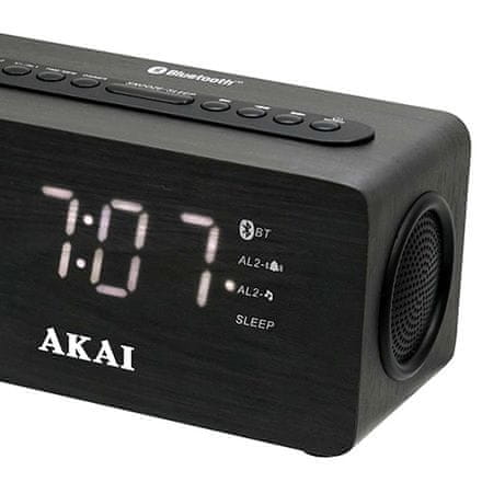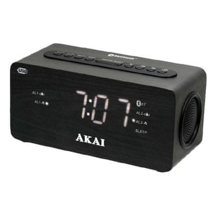 Praktični Akai radio budilica postat će vaš suputnik u vašem svakodnevnom ritualu buđenja. Ima digitalni FM PLL radio (memorija za 10 postaja), dvostruki alarm (zujalica ili radio), digitalni sat i funkciju odgode alarma ako želite ujutro malo duže spavati. Posebna značajka je Bluetooth 2.1 tehnologija za streaming vaše omiljene glazbe sa pametnog telefona ili tableta. Najvažnije informacije prikazuju se na jasnom 1,2" LED zaslonu s prigušivačem (3 postavke osvjetljenja) i bijelim brojevima. Nudi timer za spavanje, USB 1 A punjač ili Aux-In priključak (reprodukcija medija s vanjskog uređaja). Značajke: