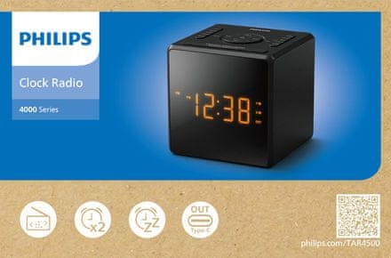 Philips TAR4500 je digitalni radio s budilicom tvrtke Philips kompaktnog dizajna i modernih značajki za spavaću sobu ili drugi osobni prostor. Nudi jasan zaslon s velikim znamenkama, mogućnost postavljanja dva neovisna alarma, FM tuner s do 20 unaprijed postavljenih postaja i praktični USB-C priključak za punjenje mobilnih uređaja.