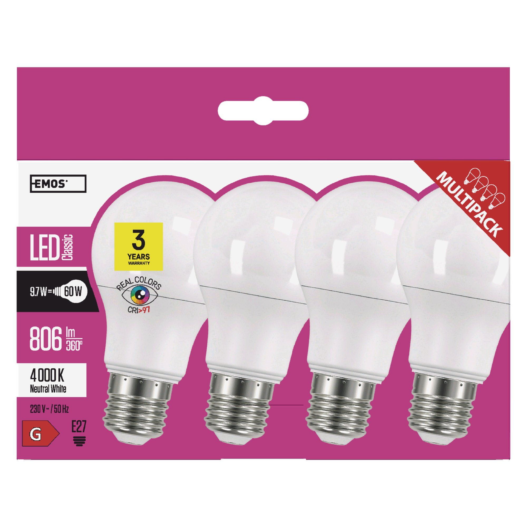 LED žarulja Classic A60 Ra95, marke Emos sa snagom 10 W i grlom E27. Svijetli neutralno bijelom bojom, prikladna za svakodnevnu uporabu. LED tehnologija brine o uštedi energije i troškova. Izdvaja se dugim vijekom trajanja do 30000 sati. Pakiranje sadrži 4 komada.