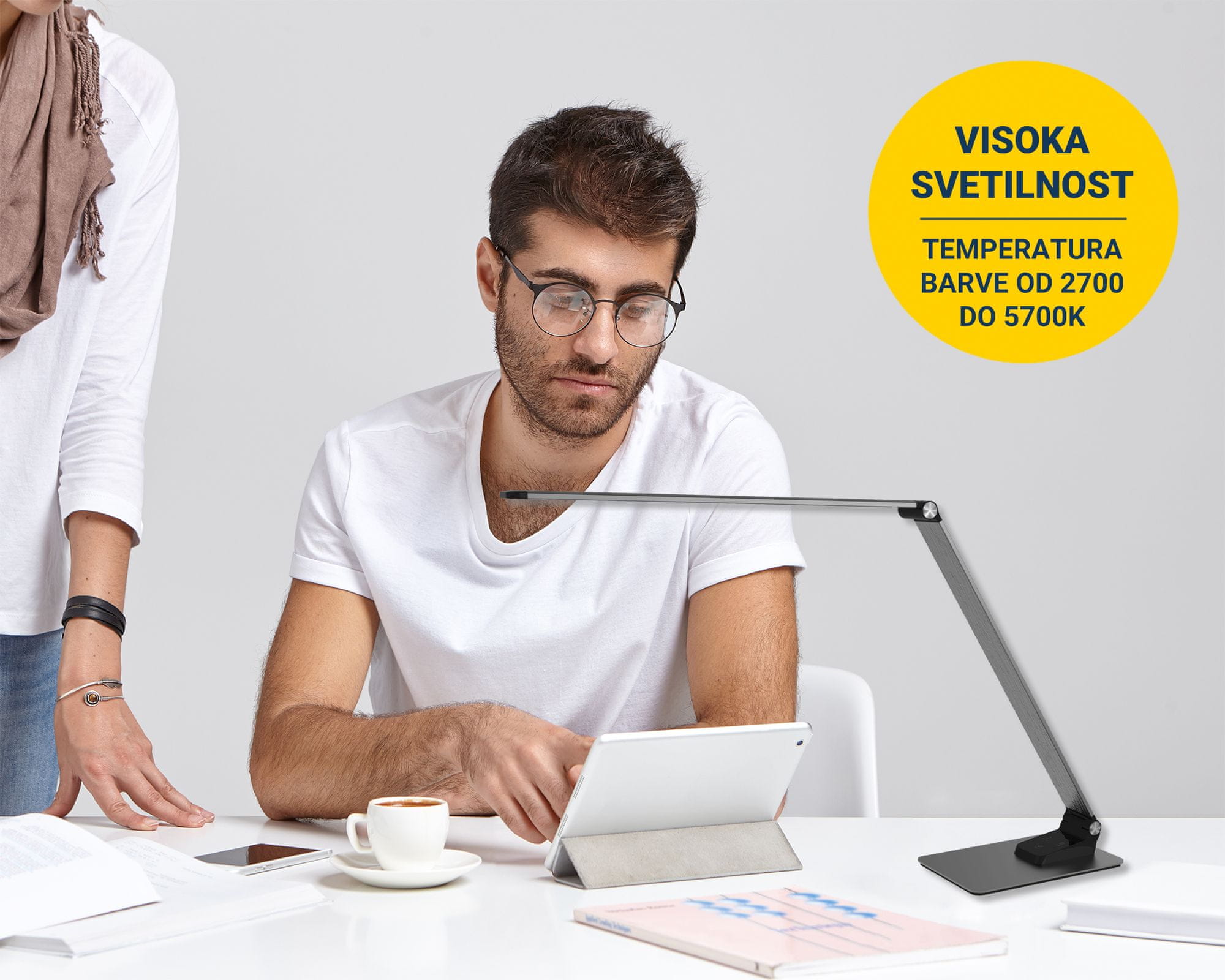 Moderna stolna LED svjetiljka tvrtke Platinet izuzetno je ekonomična, ekološki prihvatljiva i prikladna dodatna oprema u vašem domu ili uredu. 48 LED SMD dioda omogućuje ravnomjerno osvjetljavanje radnog & uredskog stola, noćnog ormarića u spavaćoj sobi ili kutka za čitanje. Podesiva i sklopiva svjetiljka nudi izbor između tri temperature boje (2800 K – 5700 K) i tri razine osvjetljenja s maksimalnom svjetlinom 500 lumena.