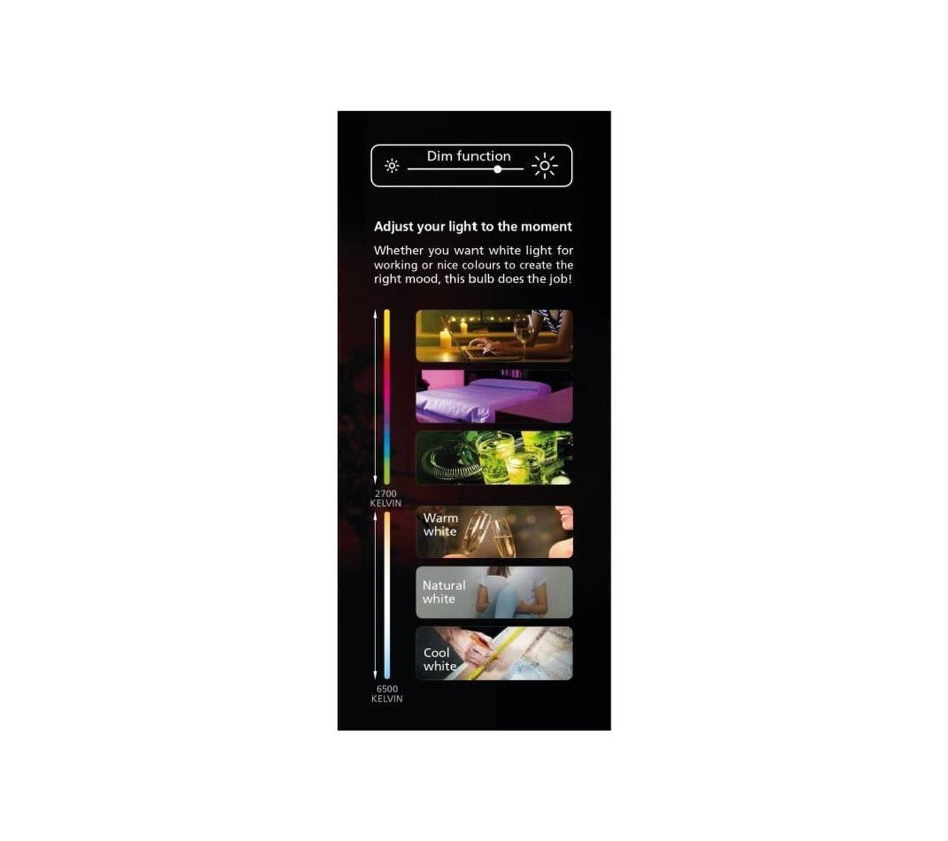 Svaka boja stvara svoju atmosferu. S pametnom lampom u boji možete prilagoditi boju u svom domu prema svom raspoloženju ili aktivnosti. Promijenite boju svjetla u jarko bijelu za trenutak koncentracije ili prigušite svjetla za noćni spoj. A ako ste raspoloženi za zabavu, možete ići do kraja s raznim svijetlim bojama. Odaberite idealno osvjetljenje za svaki trenutak.