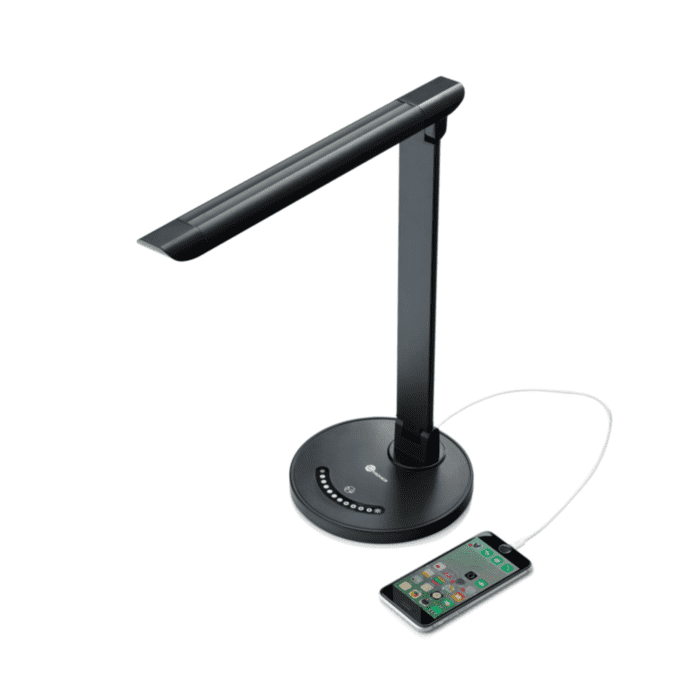 TaoTronics Elune E5 je crna LED stolna lampa s jednostavnim dodirom za podešavanje svjetline. Uključuje napajanje i USB port za punjenje uređaja. Traje 15 godina.
