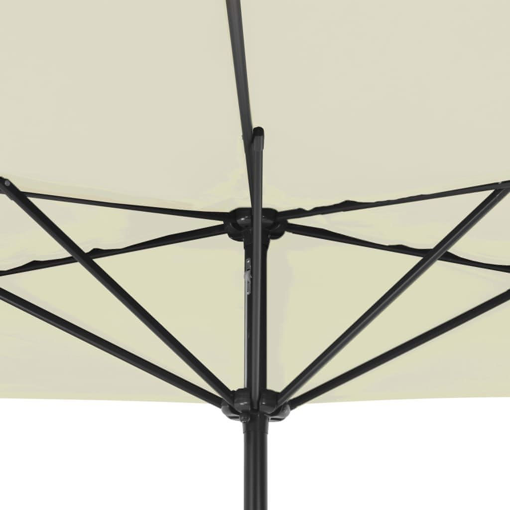 Napravljen od poliestera otpornog na UV zrake i blijeđenje, suncobran vam pruža najveću moguću zaštitu od sunca i lako se čisti. Sa šipkom promjera 38 mm, može se montirati na stalak ili u sredinu stolova s otvorom. Polukružni oblik također pridonosi jedinstvenom šarmu suncobrana. Čvrsta aluminijska šipka, zajedno s 5 izdržljivih čeličnih nosača, čini suncobran vrlo stabilnim i izdržljivim. Vrtni suncobran može se lako otvoriti i zatvoriti zahvaljujući mehanizmu s ručicom. Artikal se lako sastavlja.