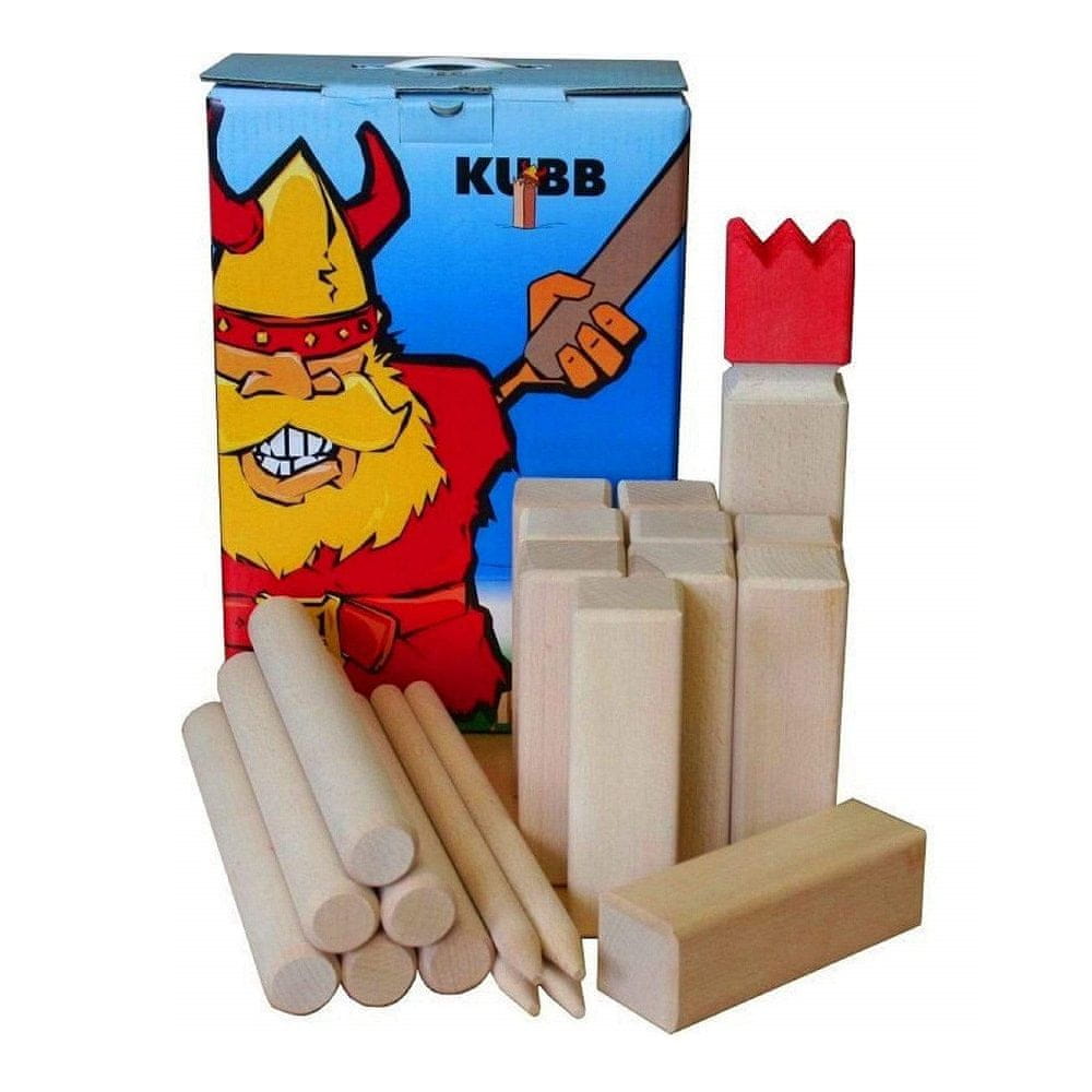 Švedska vrtna igra Kubb pogodna za djecu od 3 godine 1× figura kralja, 10× figura sluge, 6× igla za bacanje, 4× igla za označavanje, sve u ukrasnoj kutiji s uputama veličina figure: kralj 6,5 × 6,5 × 31 cm, sluge 5,5 × 5,5 × 15 cm igla za bacanje 3,5 × 30 cm, igla za označavanje 1,9 × 30 cm