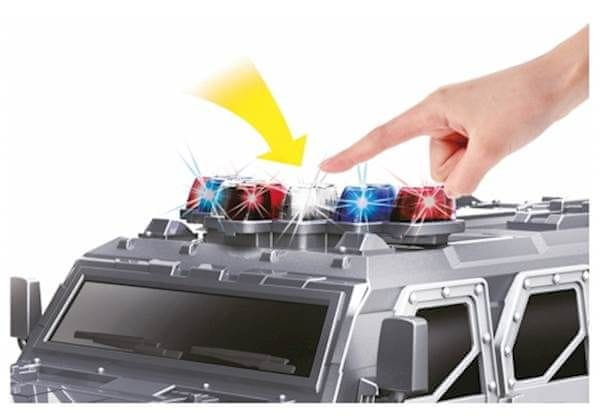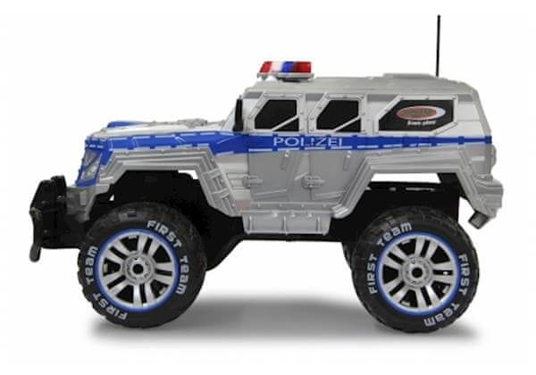 Police amored car Monstertruck je RC vozilo koje postiže brzinu od 25 km / h. Ima čvrst i istodobno fleksibilan prednji branik. Ovaj automobil ima posebne robusne gumene gume s mogućnošću zaključavanja prednje osovine, što povećava trenje i tako omogućuje „driftanje“. Vozilo je opremljeno s 11 LED signalnih svjetala kojima se upravlja daljinski i s 4 intervala signala koja se mogu isključiti. Također možete isključiti prednja dva svjetla.