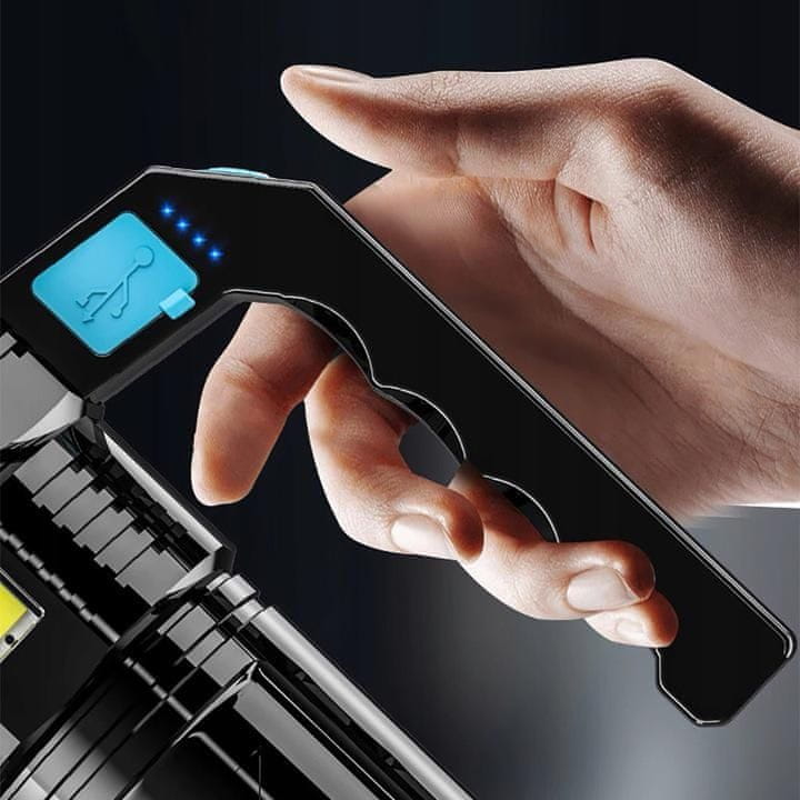Taktička svjetiljka s iznimno snažnim COB LED (bočnim) i 4 T6 diode, zatvorena u vrlo izdržljivom kućištu. Svjetiljka ima vrlo snažan izvor svjetlosti s dugim vijekom trajanja. Čvrsta, jaka ručka u gornjem dijelu osigurava sigurno držanje i udobnu upotrebu. Lampa je također otporna na vodu i udarce. Prekidač je pričvršćen čvrstom gumom, a o-prstenovi štite uređaj od prljavštine i prašine. Sa strane su dodatne LED diode. Ugrađena baterija puni se putem priloženog USB kabela, a njezina napunjenost vidljiva je putem LED indikatora.