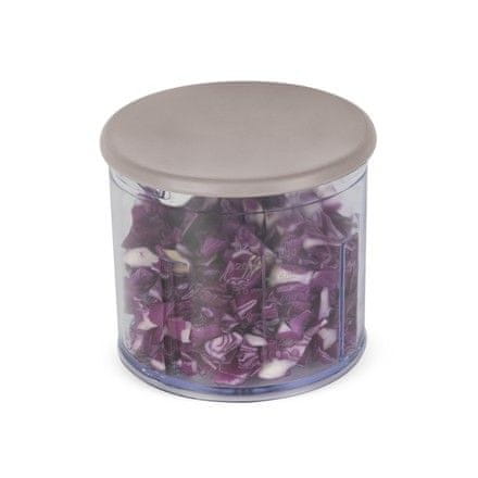 Kompaktni i snažni 2-u-1 električni sjeckalica u elegantnoj mat sivo-smeđoj boji praktičan je pomoćnik u svakoj kuhinji. Zahvaljujući dvostrukoj oštrici, lako može sjeckati povrće, začinsko bilje i orašaste plodove. Poklopac vam omogućuje korištenje posude za izravno pohranjivanje hrane.