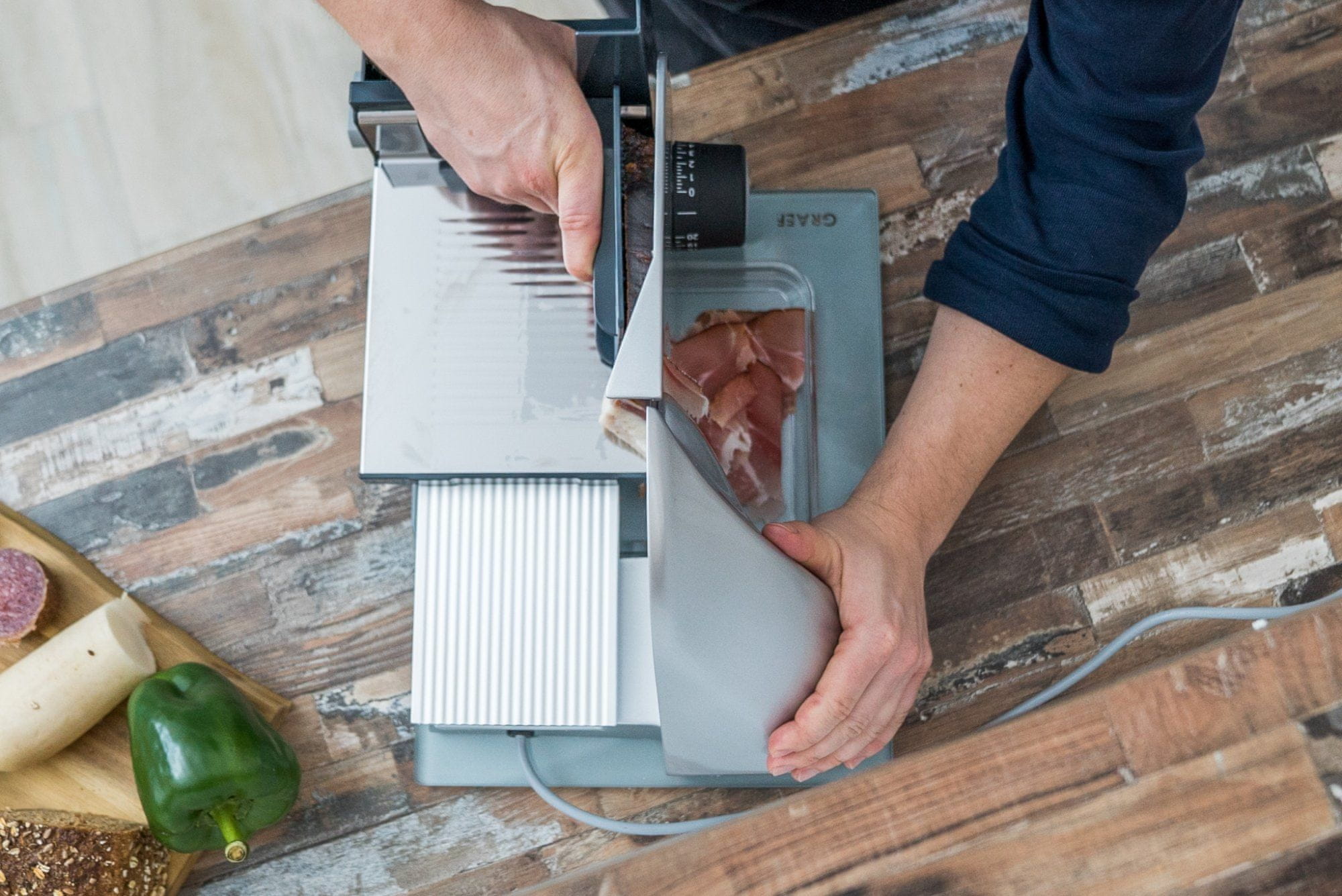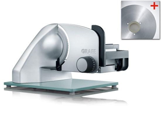 Rezač Graef Classic 22 Twin ima dvije oštrice, štedni motor snage 170 W, blokadu za djecu, funkciju kontinuiranog rada i MiniSlice nastavak.