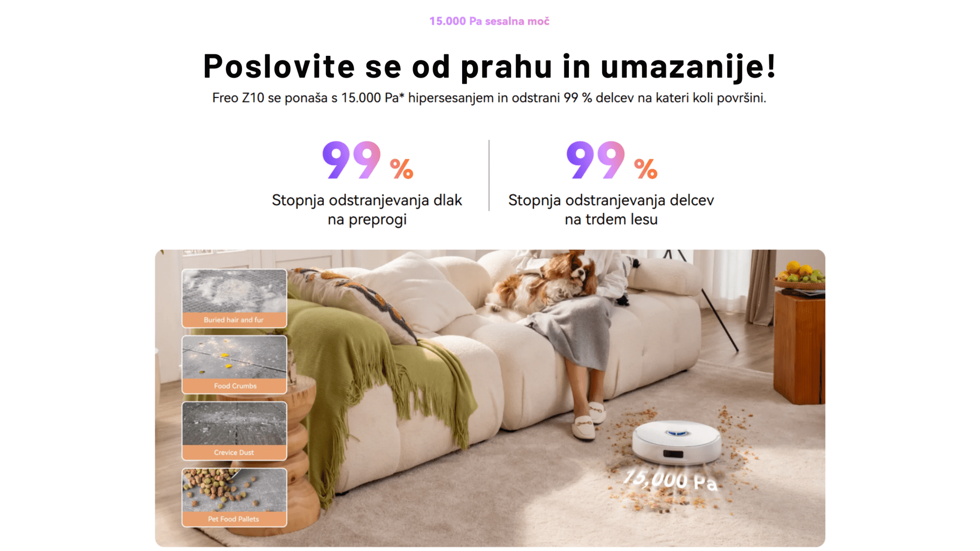 Sve to koordinira Freo Mind 2.0 Pro pametni sustav, koji osigurava optimalne strategije čišćenja, prilagodbu površine i savršenu navigaciju. Višenamjenska samočisteća stanica zaokružuje cjelokupno iskustvo s automatskim pranjem, sušenjem, pražnjenjem i doziranjem – za čist dom bez napora.