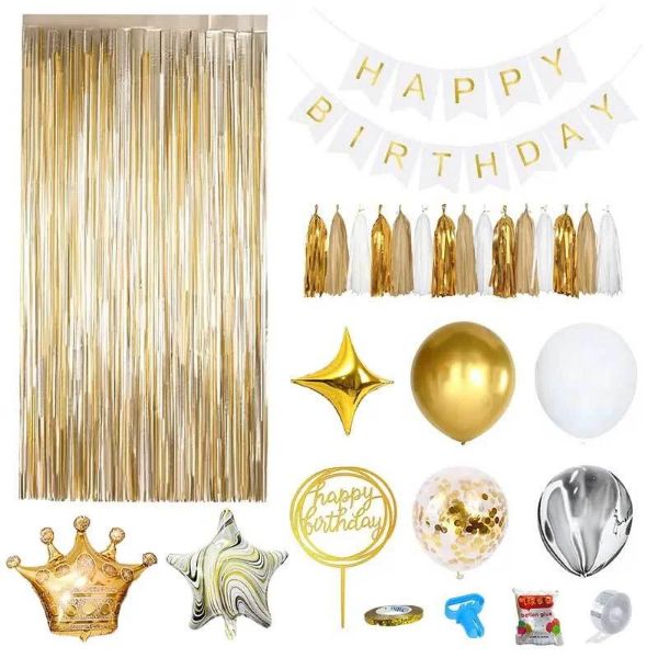 60 balona raznih boja; 1× balon u obliku krune; 2× balona u obliku petokrake zvijezde; 2× balona u obliku četverokrake zvijezde; 1× zavjesa od svjetlucavih traka; 1× banner za sretan rođendan; 5× set šarenih ukrasnih resica; 1× Happy Birthday ukras za tortu; Ukrasna traka, pribor za vezivanje balona, ljepilo i traka za pričvršćivanje balona.