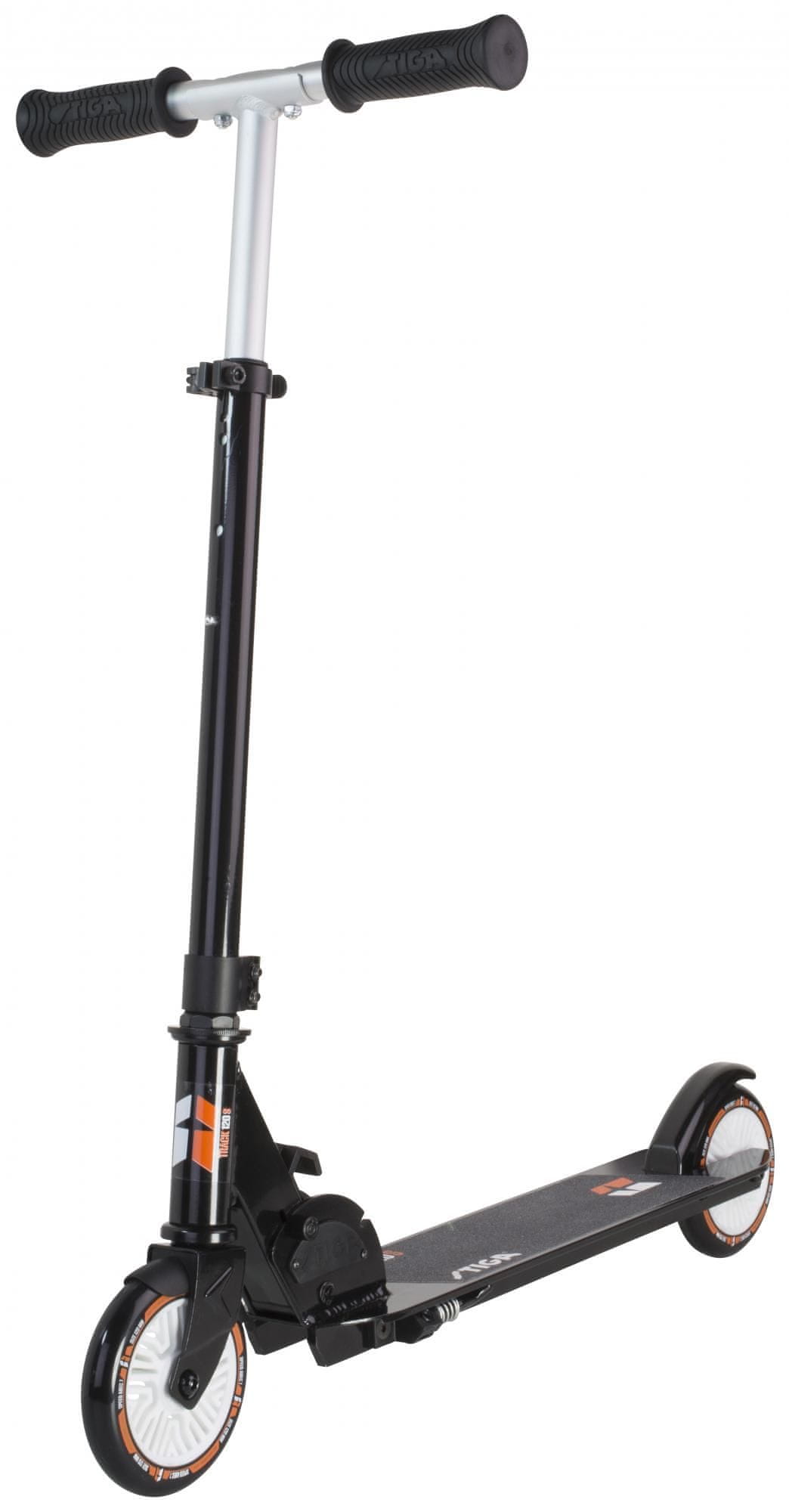 Romobil s čeličnom i aluminijskom konstrukcijom, kotačima od 200 mm, kočnicom s niskim pločama i nožnim kočnicama.