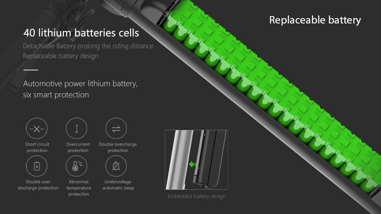 Baterija je ugrađena u poseban otvor koji se nalazi u okomitoj ručki upravljača. Zamjena je brza i jednostavna, a možete je puniti ili kada je ugrađena na romobil ili zasebno nakon uklanjanja, jer baterija ima ugrađenu utičnicu za punjenje. Vrijeme potrebno za punjenje baterije do maksimalnog kapaciteta je otprilike 5 sati.