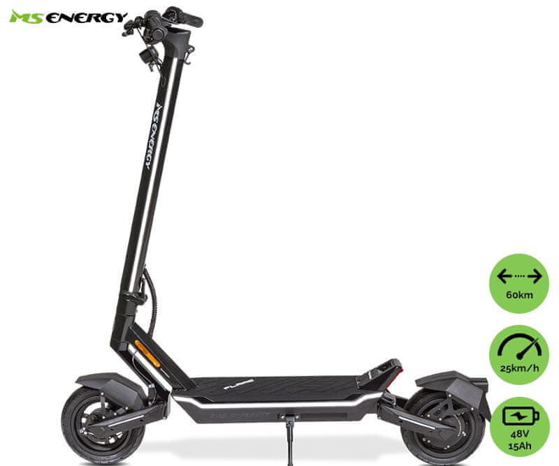 MS Energy električni romobil sa samobrtvećim gumama od 25,4 cm (10''), prednjim i stražnjim ovjesom, snažnim motorom od 600 W i dometom do 60 km. Opremljen je prednjim i stražnjim LED osvjetljenjem, LED pokazivačima i LCD zaslonom, koji pruža sve ključne informacije o vožnji.