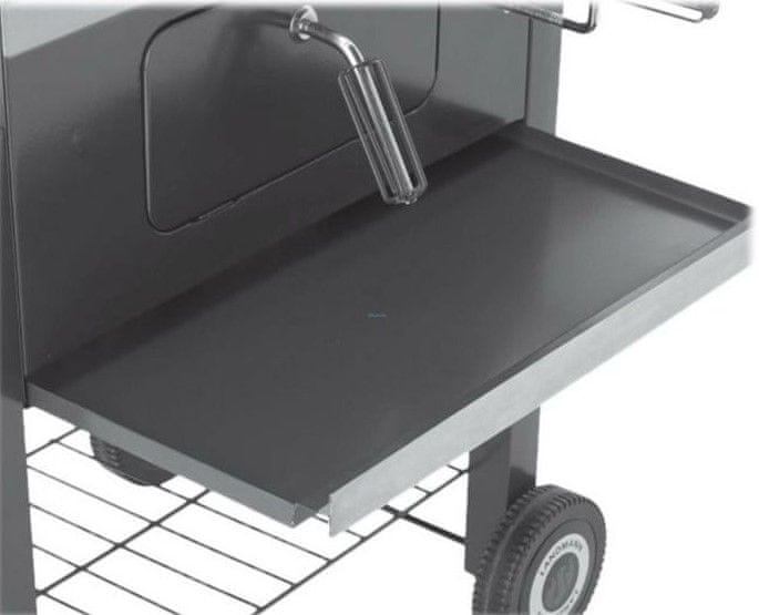 Prednji dio roštilja opremljen je velikim vratima za lak pristup. Čišćenje je jednostavno zahvaljujući ladici za pepeo koji se može ukloniti. Roštilj ima dvije bočne police za odlaganje hrane ili drugog pribora. Police su sklopive, što će uštedjeti prostor prilikom odlaganja roštilja. Drveni ugljen možete spremiti ispod roštilja, gdje se nalazi skladište, pa će vam uvijek biti pri ruci. Sa strane se nalazi otvor za ventilaciju koji omogućuje protok zraka i utječe na brzinu izgaranja. Roštilj također ima dva kotača, koji služe za lakši transport po terasi ili vrtu.
