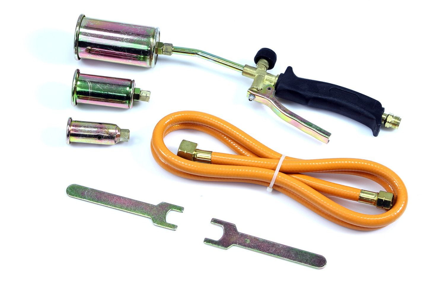 Izrađen od visokokvalitetnog čelika, pocinčan i žuto pasiviran. Ergonomska, toplinski izolirana ručka s okidačem i gumbom za kontrolu protoka plina. Priloženo je visokotlačno crijevo s plinskim priključcima. Pogodan za pokrivanje krovova, paljenje cesta i suzbijanje korova. Uključuje set od tri plamenika.