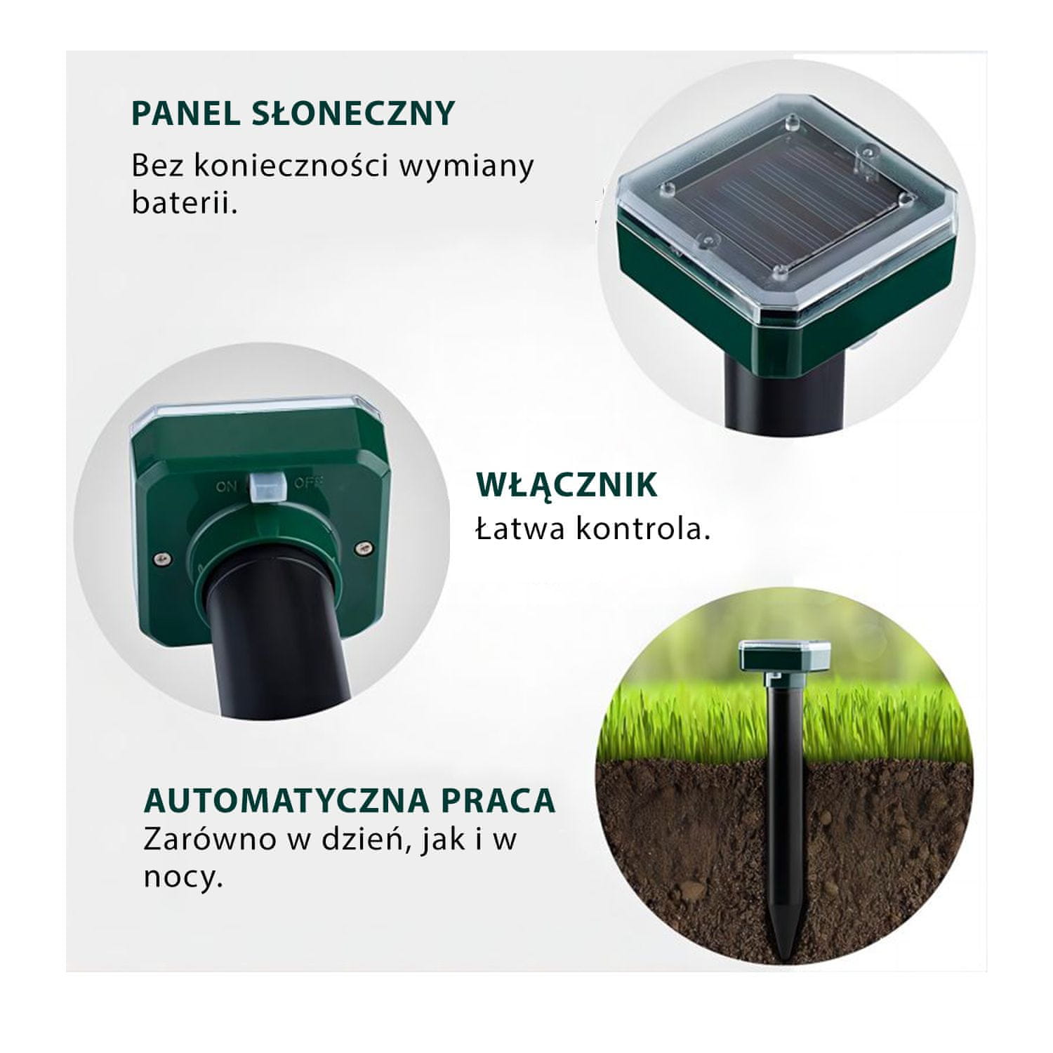 Uživajte u prekrasnom i zdravom vrtu bez štetočina uz set solarnih repelenta Bass Polska! Zaboravite na oštećene biljke i dosadne glodavce. Inovativni solarni repelenti za glodavce koriste solarnu energiju za učinkovito odbijanje štetočina, a istovremeno osiguravaju sigurnost ljudi i životinja. Zahvaljujući širokom rasponu djelovanja, vaš će vrt biti potpuno zaštićen 24/7. Instalirajte naše solarne repelente za krtice i uživajte u miru i ljepoti svog vrta! Prednosti Bass Polska repelera protiv štetočina su: