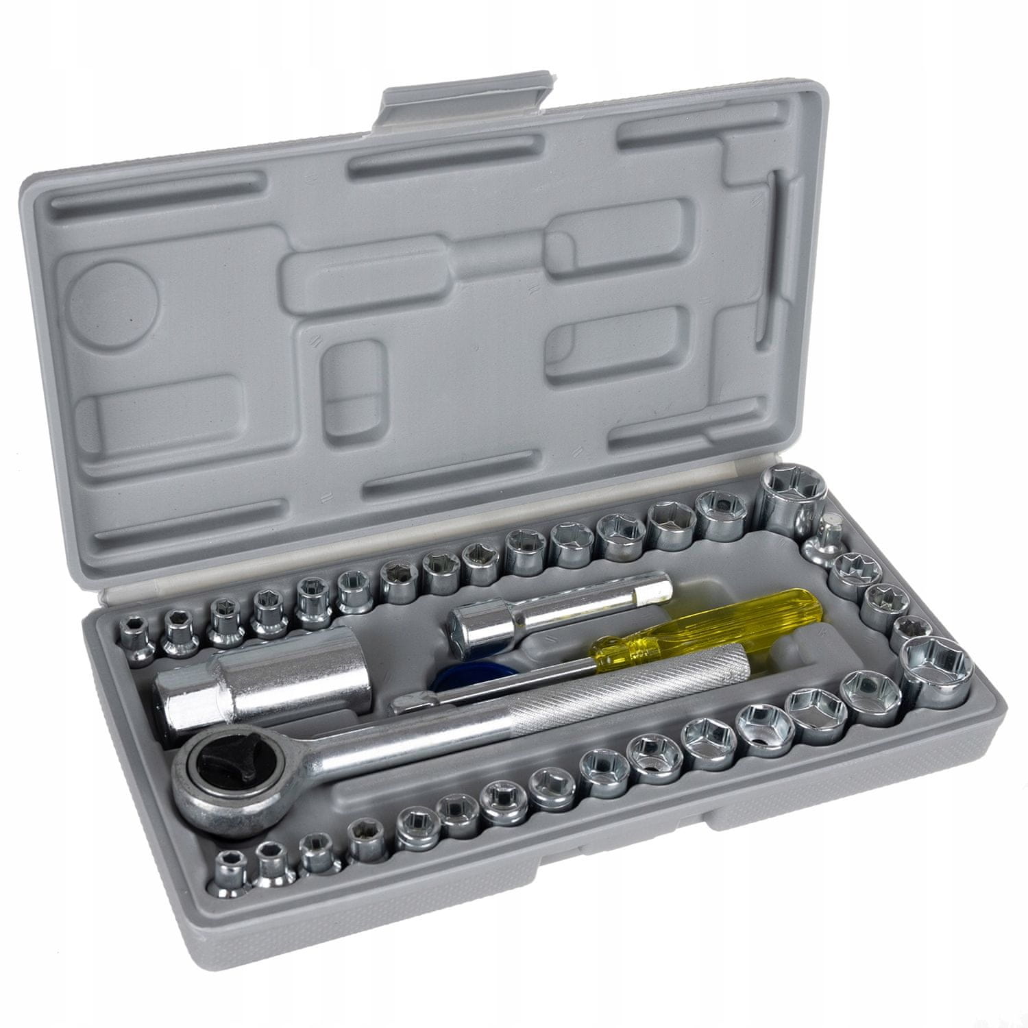 - VRLO VELIKI SET DO 40 ELEMENATA – 16 utičnica 4 mm / 4,5 mm / 5,0 mm / 5,5 mm / 6 mm / 6,5 mm / 7 mm / 7,5 mm / 8 mm / 9 mm / 10 mm / 11 mm / 12 mm / 13 mm / 15 mm / 16 mm, 14 utičnica 5 / 32–3 / 16–7 / 32–1 / 4–9 / 32–5 / 16/11 / 32–3 / 8 –13 / 32–7 / 16 –15 / 32–1 / 2– 7 / 32–9 / 16, 3 utičnice 1 / 4–5 / 16–3 / 8, adapter, ručka, produžetak, čegrtaljka, utičnica 21 mm, adapter za prednapon kućišta.