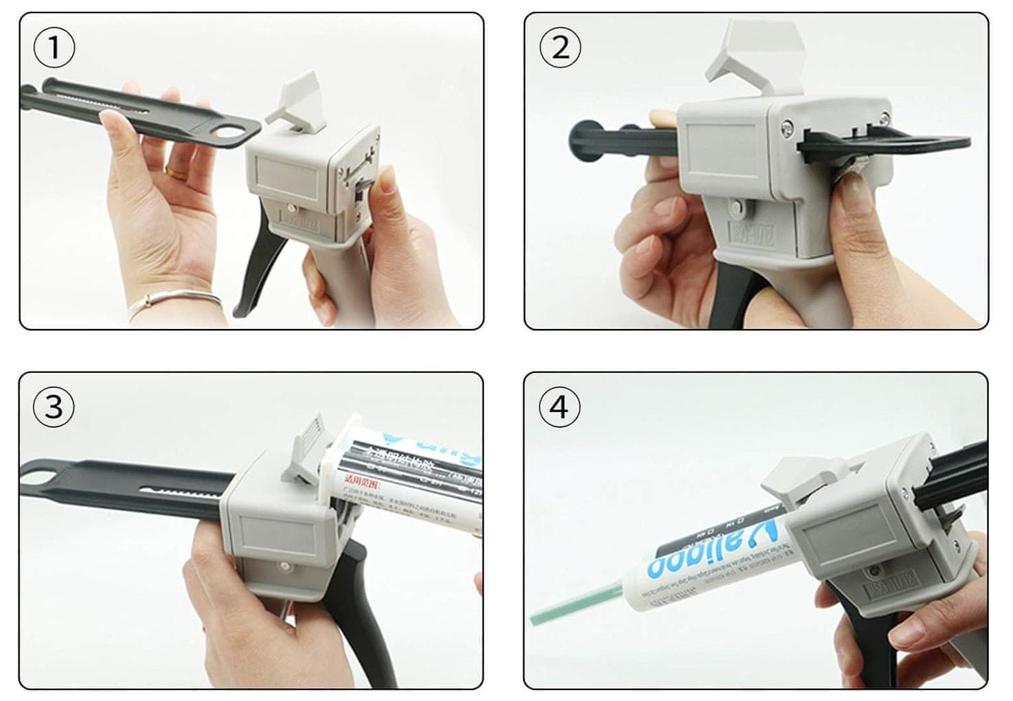 Sastavljanje pištolje: Crni potisni bat se umetne u tijelo pištolje s prednje strane. Kartuša se umetne u prednji dio pištolje za istiskivanje i osigura sigurnosnim zatičem. Odvrnite žuti poklopac na kartuši (bajonetni poklopac). Umetnite miješajući nastavak. Sada možete početi istiskivati ljepilo, koje je već pomiješano u pravilnom omjeru. Nakon završetka rada potrebno je ukloniti miješajući nastavak. Prije početka novog postupka lijepljenja treba koristiti novi miješajući nastavak.