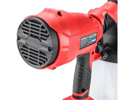 HVLP pištolj za prskanje na baterije idealan je za prskanje kod kuće, na vikendici ili na bunaru. Veća snaga omogućuje korištenje gušćih vrsta boje ili manje razrijeđenog boje, što omogućuje veću brzinu. Pištolj za prskanje omogućuje regulaciju količine nanesene boje i ima 3 vrste mlaza za nanošenje – horizontalni i vertikalni mlaz te kružni/točkasti mlaz. Može se koristiti za nanošenje sljedećih boja i tekućina: plastične i lateks boje, boje na bazi vode, temeljne i emajl boje, boje na bazi ulja ili aluminija, završni premazi, automobilske ili drvene završne obrade, lakovi, proizvodi za zaštitu drva, sredstva za zaštitu drva i drva, dezinficijensi. Spremnik za prskanje ima volumen od 900 ml i zahvaljujući svom dizajnu može se ponovno napuniti bez rastavljanja. Gumirana ručka je udobnija, lakša za držanje i smanjuje umor tijekom upotrebe. Za normalan domet dopuštene su jedna ili dvije baterije od 2000 mAh, koje možete brzo napuniti brzim punjačem, za zahtjevnije ili dulje domete preporučujemo veće baterije kapaciteta 4000–8000 mAh. Baterija se može koristiti sa svim vrstama alata serije EXTOL SHARE20V. Zahvaljujući korištenoj Li-ion tehnologiji, može se puniti u bilo kojem trenutku bez smanjenja kapaciteta. Li-ionska baterija vrlo sporo gubi energiju zbog samopražnjenja i dugo traje napunjena i spremna za upotrebu.