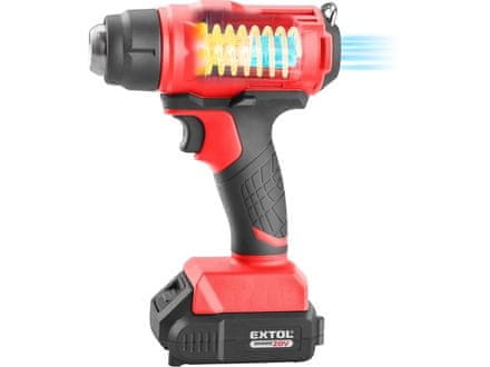 Baterijski toplinski pištolj s temperaturom zraka do 550°C namijenjen je za oblikovanje, skupljanje i spajanje plastike, savijanje plastičnih cijevi, otpuštanje lijepljenih spojeva, odmrzavanje smrznutih cijevi, uklanjanje mahovine i kore s pločica, paljenje ugljena za roštiljanje, sušenje itd. U maloj mjeri može se koristiti i za uklanjanje stare boje i lakova. Pištolj se zagrijava na radnu temperaturu za 5 sekundi nakon uključivanja zahvaljujući elektroničkoj kontroli grijanja. Kako bi se povećao vijek trajanja stroja, ventilator nastavlja raditi nekoliko sekundi nakon otpuštanja prekidača kako bi se ohladila grijaća zavojnica. Pištolj je opremljen LED lampom koja osvjetljava radno područje tijekom izvlačenja i kukom za vješanje. Isporuka uključuje tri zamjenjive mlaznice – redukcijsku mlaznicu (uski protok zraka): za koncentriranje protoka zraka (toplinska linija) na malu površinu, npr. za lemljenje ili savivija pleksiglasa, široku mjernicu: za preježanje šireg arjeda, za mlaznicu za cijevi: za preježanje cijevi. Zahvaljujući integriranom senzorskom prstenu, vrući vrh se može brzo ukloniti s pištolja i zamijeniti drugim bez čekanja da se ohladi ili bez upotrebe kliješta. Za normalan domet dopuštene su jedna ili dvije baterije od 2000 mAh, koje možete brzo napuniti brzim punjačem, za zahtjevnije ili veće domete preporučujemo veće baterije kapaciteta 4000–8000 mAh. Baterija se može koristiti sa svim vrstama alata serije EXTOL SHARE20V. Zahvaljujući korištenoj Li-ion tehnologiji, može se puniti u bilo kojem trenutku bez smanjenja kapaciteta. Litij-ionska baterija vrlo sporo gubi energiju zbog samopražnjenja i dugo traje napunjena i spremna je za upotrebu.