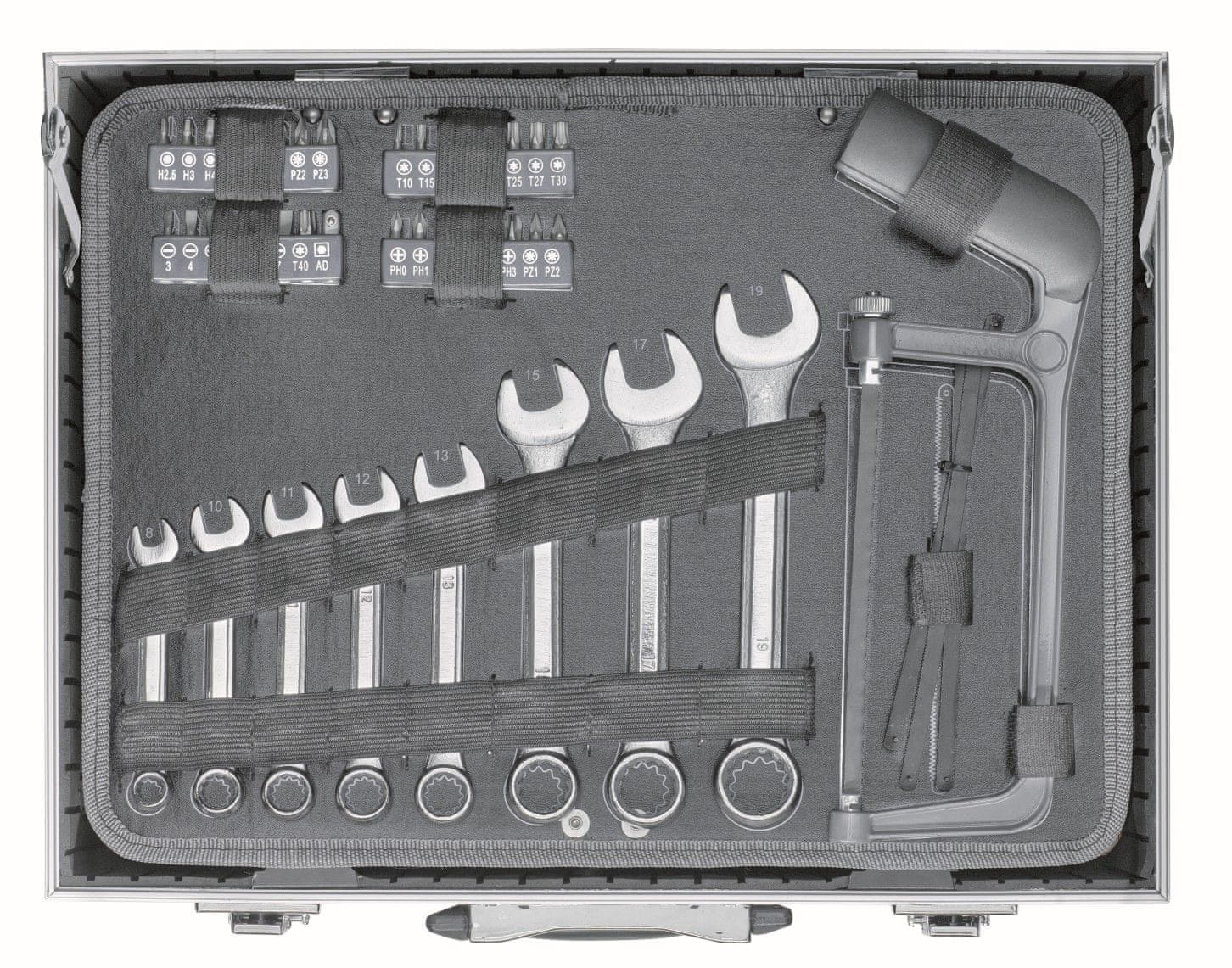 - 25× set utičnica: 10× 1/4" 4,4.5,5,5.5,6,6.5,7,8,9,10 mm, 5× 1/4" 8,10,11,12,13 mm, 2× 1/4" produžetak 2" i 4", 1× 1/4" nasadni ključ, 1× 1/4" T-klizna ručka, 1× 1/4" ručka s držačem nasadnog ključa, 1× 1/4" ručni odvijač s reverzibilnom čegrtaljkom, 3× 3/8" ključevi 11 ,12,13 mm, 1× 3/8–1/4” adapter