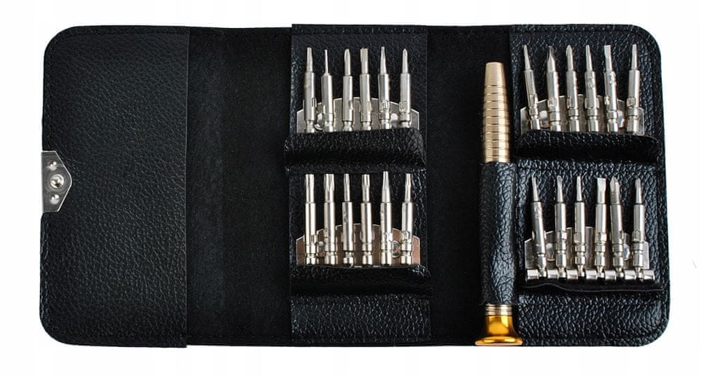 Popravak suvremenih elektroničkih uređaja zahtijeva ne samo vještinu, već i korištenje odgovarajuće i precizne opreme. Proizvođači koriste različite vrste štitnika, što znači da su za njihovo otvaranje potrebni dodatni bitovi, koje je teško pronaći u osnovnim setovima odvijača. Set specijaliziranih odvijača sastoji se od 25 elemenata u kućištu zatvorenom magnetom. Svaki element ima svoje mjesto, što omogućuje urednu i učinkovitu organizaciju radnog mjesta, a time i njegovu brzu i točnu izvedbu. Set je namijenjen za popravak telefona, pametnih telefona i tableta te svih ostalih uređaja i opreme koji imaju nestandardne, male vijke.Servisni kit naći će širok raspon primjena i može se uspješno koristiti u popravcima nakita i satova kao iu popravcima elektroničke ili optičke opreme. Također je savršen za male kućne popravke koji zahtijevaju odvijače. Kutija sadrži 24 odvijača u redovima od 6. Svaki vrh se nalazi u posebnom držaču. Da