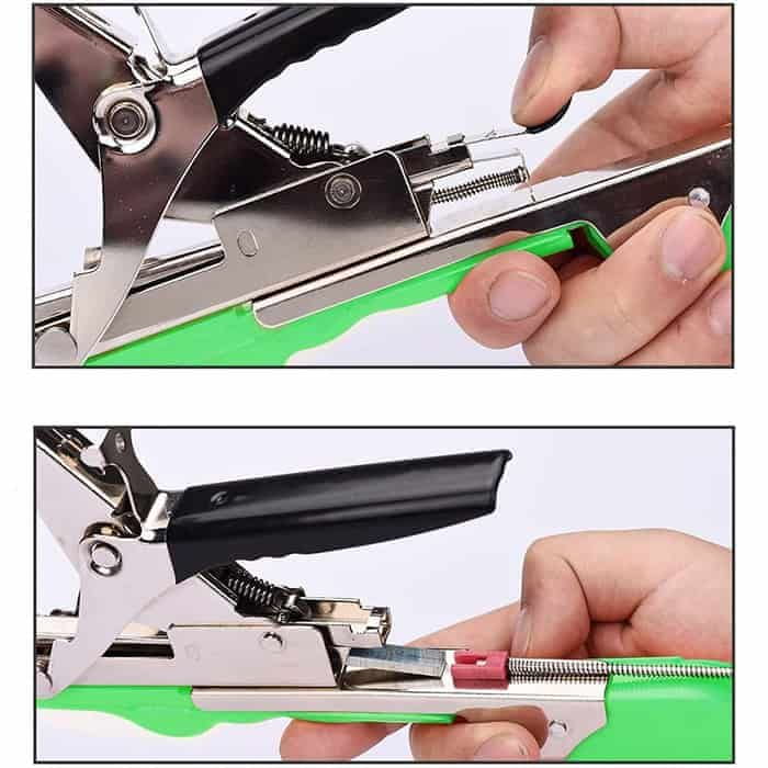 Traku i spajalice postavite u spenjač za biljke u odgovarajući položaj. Alat postavite oko stabljike ili grane i potpore te pritisnite ručku kako bi se formirala petlja koja pričvršćuje biljku na potporu.