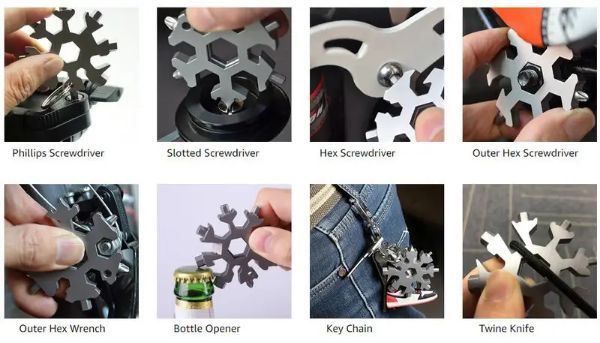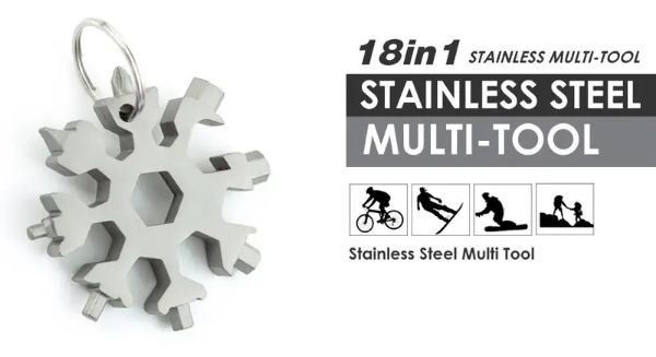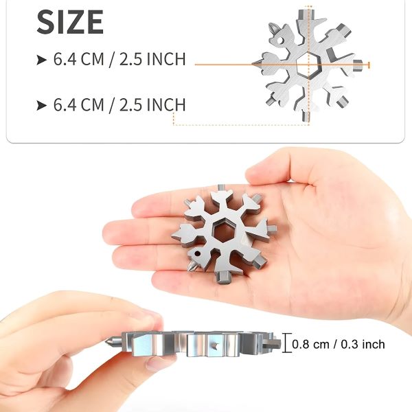 Kompaktan višenamjenski alat u obliku snježne pahulje nudi 18 funkcija u samo 65 g. Idealan za zatezanje vijaka, popravke bicikla ili snowboarda te kao otvarač. Izrađen od čelika, lako se nosi na privjesku ili ruksaku—praktičan alat i odličan poklon.