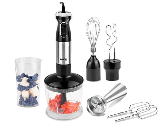 EMAVO ručni mikser je svestrani ručni mikser dizajniran za individualno i ubrzavanje vaših kuhinjskih zadataka. Opremljen snažnim motorom od 1000 W, učinkovit miješa, sjecka, blenda i pasira čak i tvrdokorne sastojke. Ovaj višenamjenski set uključuje mjernu posudu od 600 ml, zdjelu za sjeckanje od 600 ml s izdržljivim oštricama od nehrđajućeg čelika, nastavak za pjenjaču i dva nastavka za miješanje, što ga čini idealnim za izradu smoothieja, umaka, juhe i još mnogo toga.