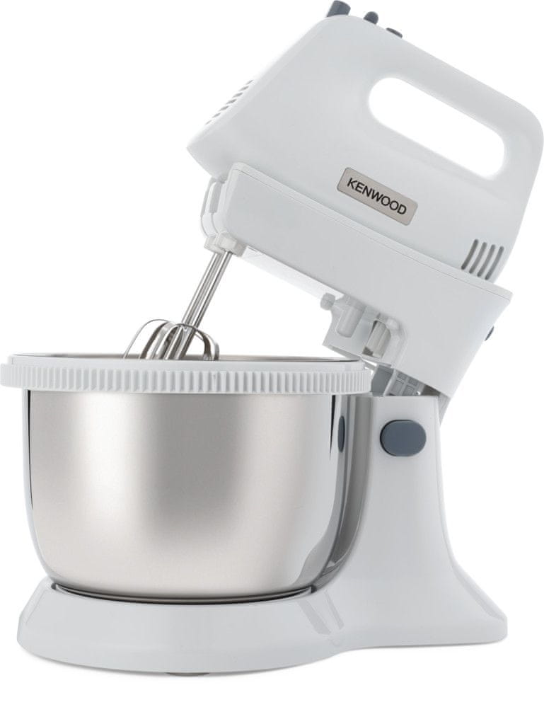 Kuhinjski procesor Kenwood HMP34.A0WH je kombinacija kompaktnog samostalnog i ručnog miksera. Radi sa snagom od 450 W i ima 5 podesivih brzina i turbo funkciju. Odlikuje ga kompaktan dizajn izrađen od izdržljive plastike i rotirajući spremnik od nehrđajućeg čelika volumena 3 litre. Posuda nudi dovoljno prostora za miješanje 500 ml kreme i smjese za tijesto za 12 cupcakesa.