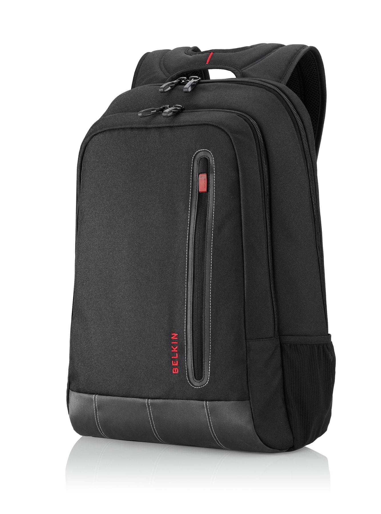 Ruksak GBP-011 Explorer – crni s crvenim detaljima: vodootporni ruksak za laptope do 14", s više pretinaca, bočnim mrežastim džepovima i udobnim podstavljenim naramenicama i stražnjim dijelom.